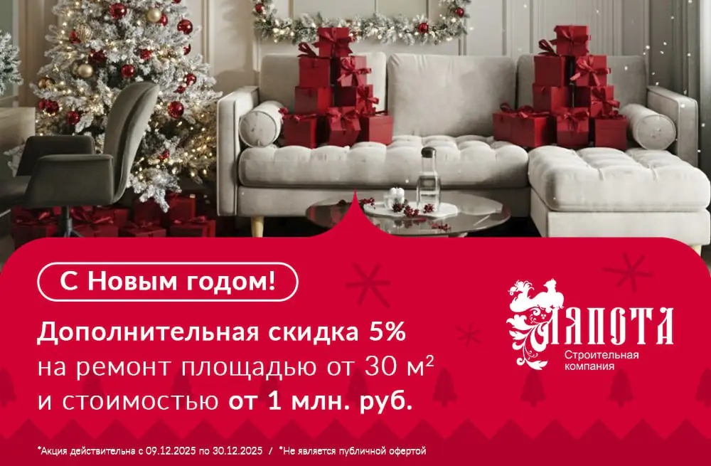 Акция «С Новым годом», в рамках которой при заключении с клиентом договора на ремонтно — отделочные работы квартиры площадью от 30 м2 и на общую сумму от 1 000 000 рублей. Организация предоставляет дополнительную скидку 5%.
